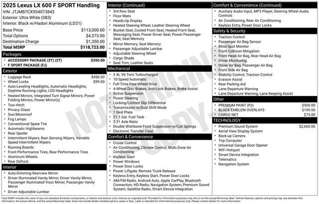 Exterior enhancements, such as the premium paint and cross bars, elevate the LX 600 F SPORT's already striking presence, while the accessory package adds a touch of personalization to suit your lifestyle. This exceptional SUV is more than just a mode of transportation – it's a statement of refined taste and uncompromising quality.